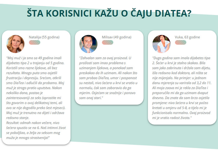 Opažanja stručnjaka pokazuju da redovita upotreba proizvoda za dijabetes Diatea uklanja ne samo simptome ove podmukle bolesti, već i moguće uzroke patoloških poremećaja u tijelu, a daje izvrsne rezultate.